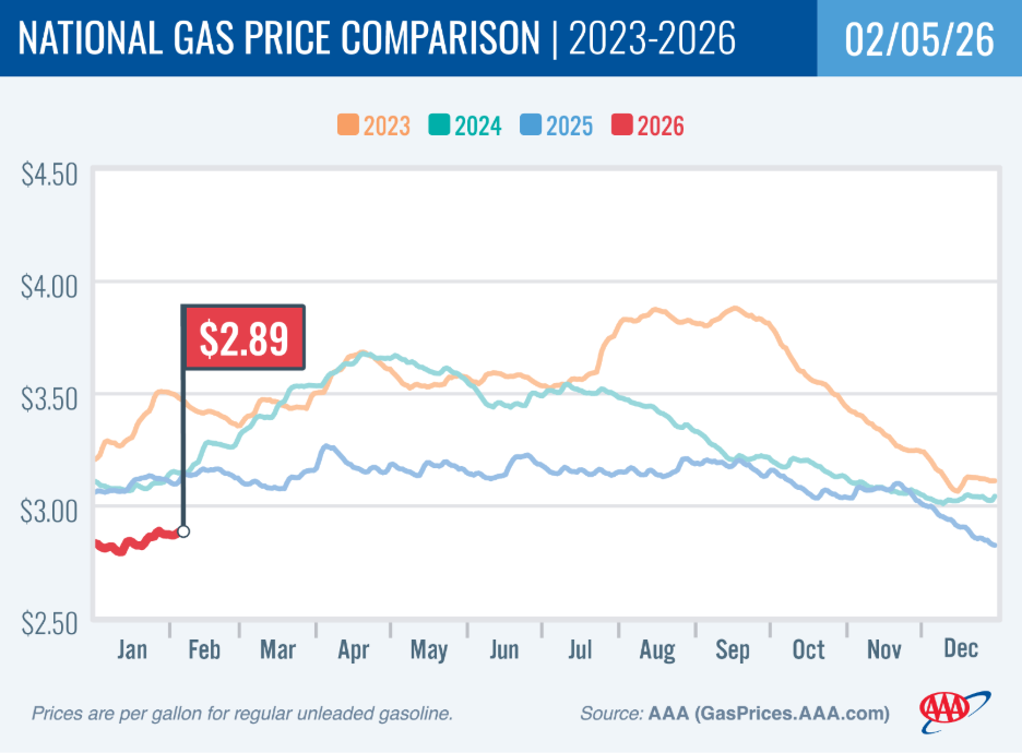WASHINGTON, DC (February 5, 2026) – The month of February is kicking off with slightly higher gas prices. The national average for a gallon of regular is up a couple of cents from last week at $2.89. Gasoline demand is down, as fewer drivers hit the road during the recent winter storms. But this is the time of year when pump prices start nudging higher, as spring approaches and refineries start making the switch to summer-blend gasoline production. Current prices remain below what they were this time last year when the national average was $3.12.